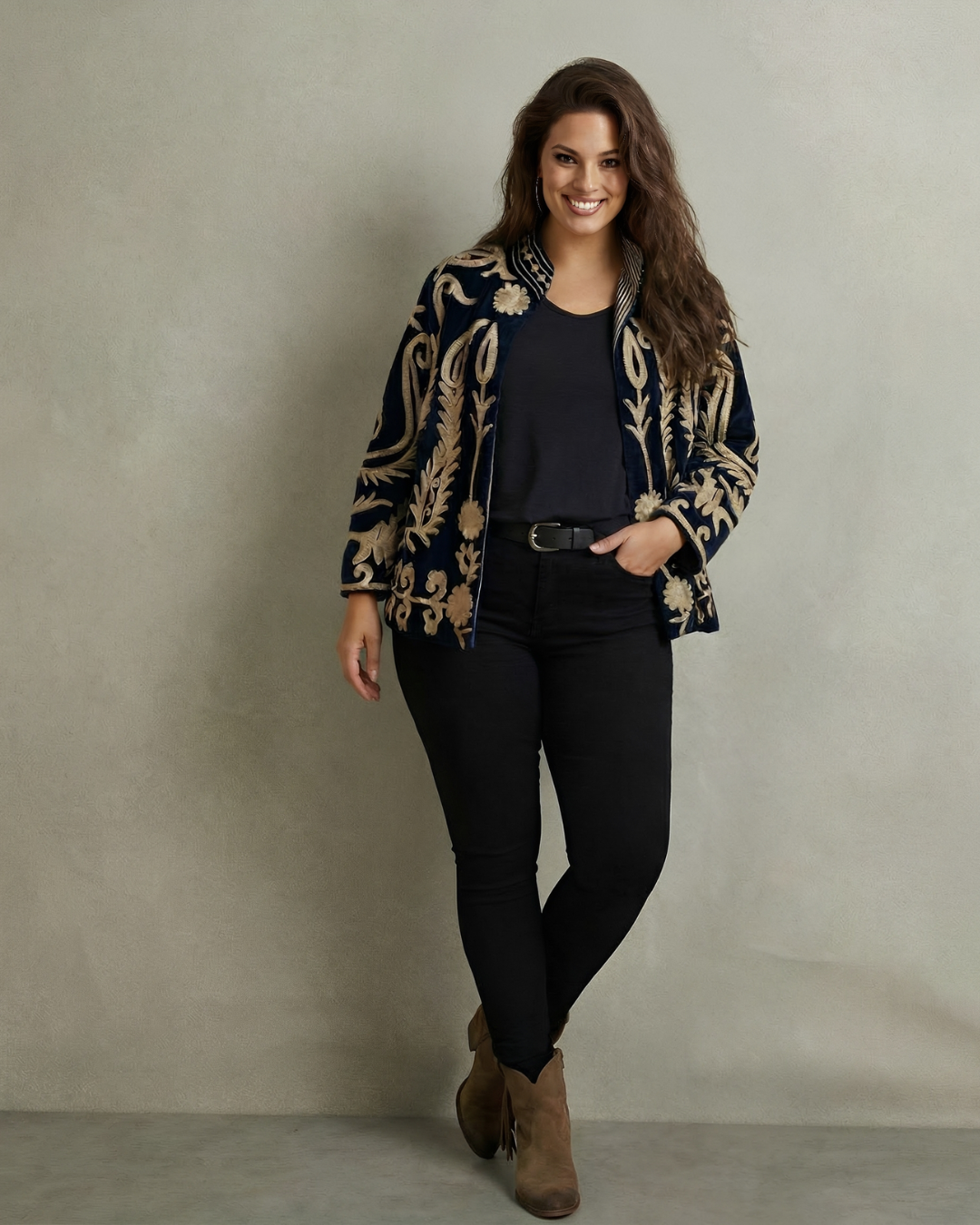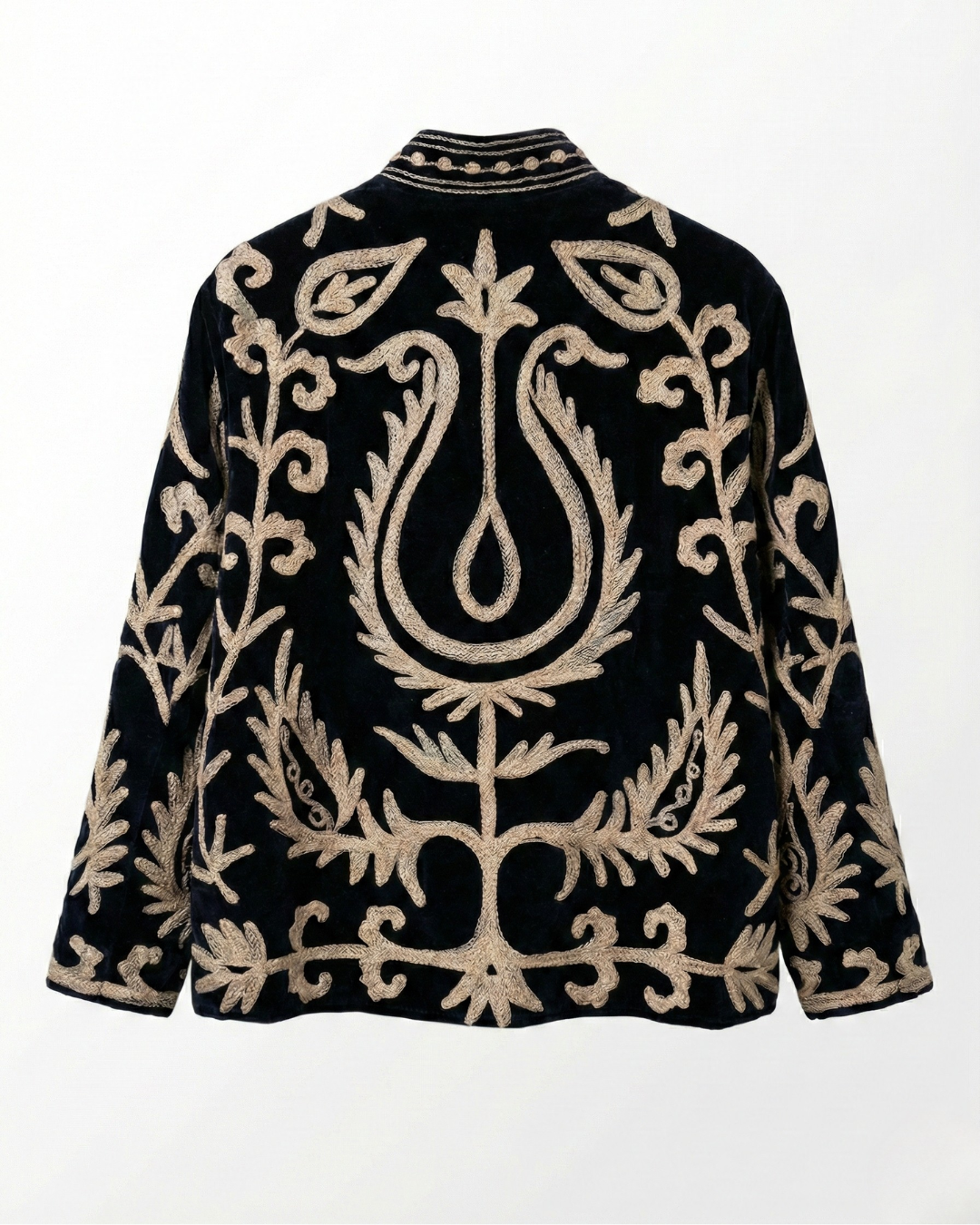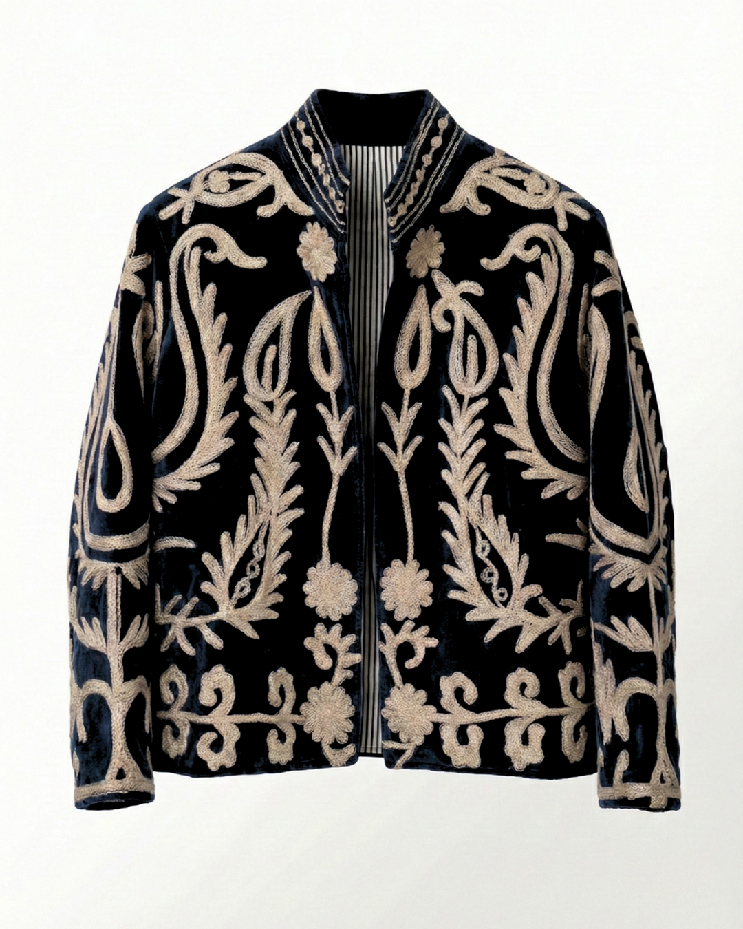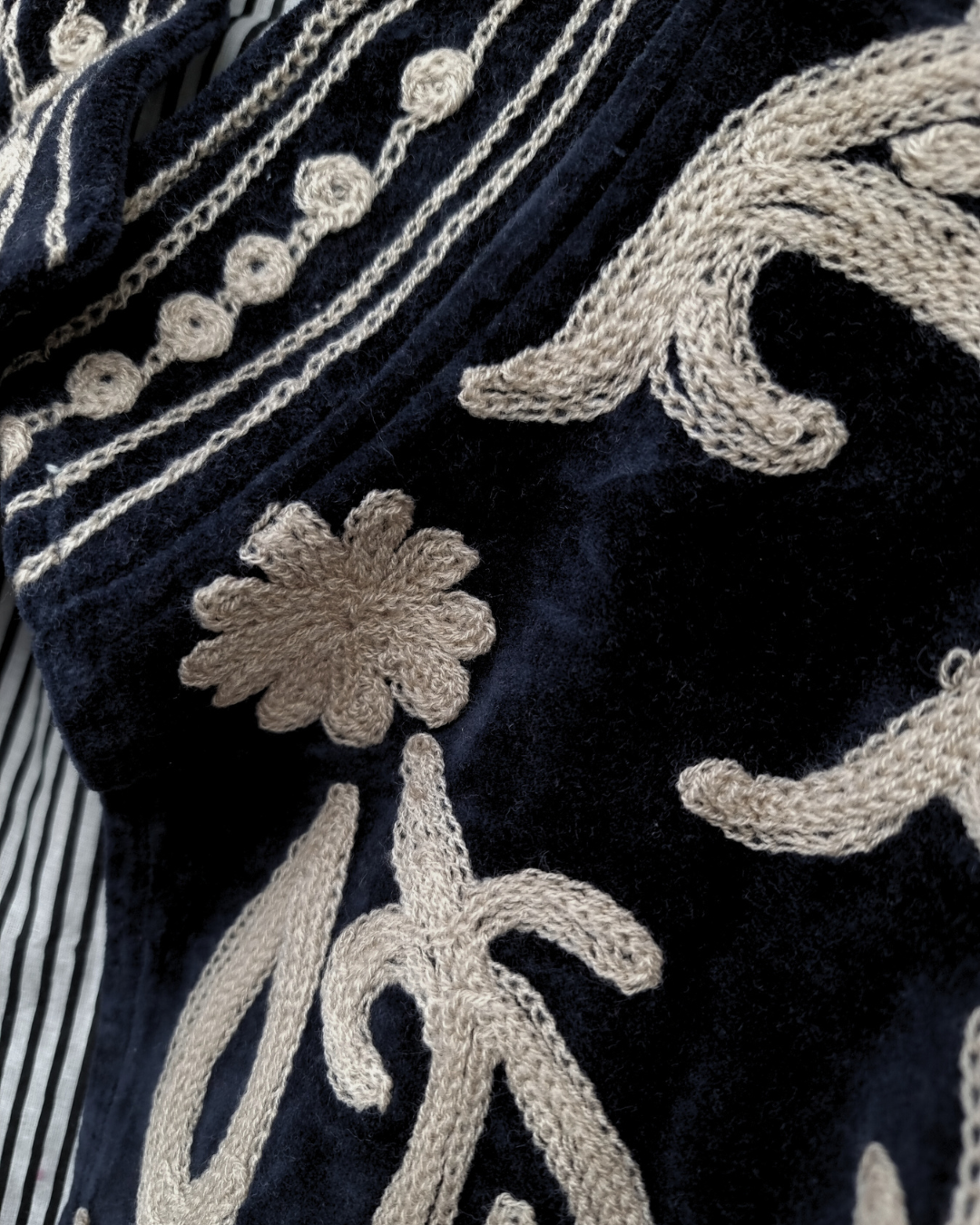Efni Sléttflauel og bómullar fóður, ísaumur ullarblandaður tvinni.