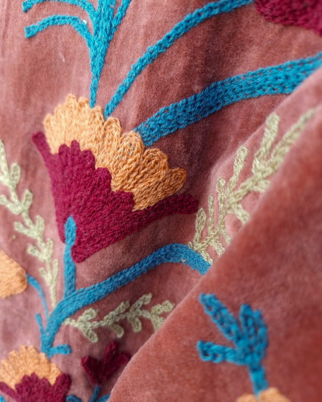Efni Sléttflauel og bómullar fóður, ísaumur ullarblandaður tvinni.