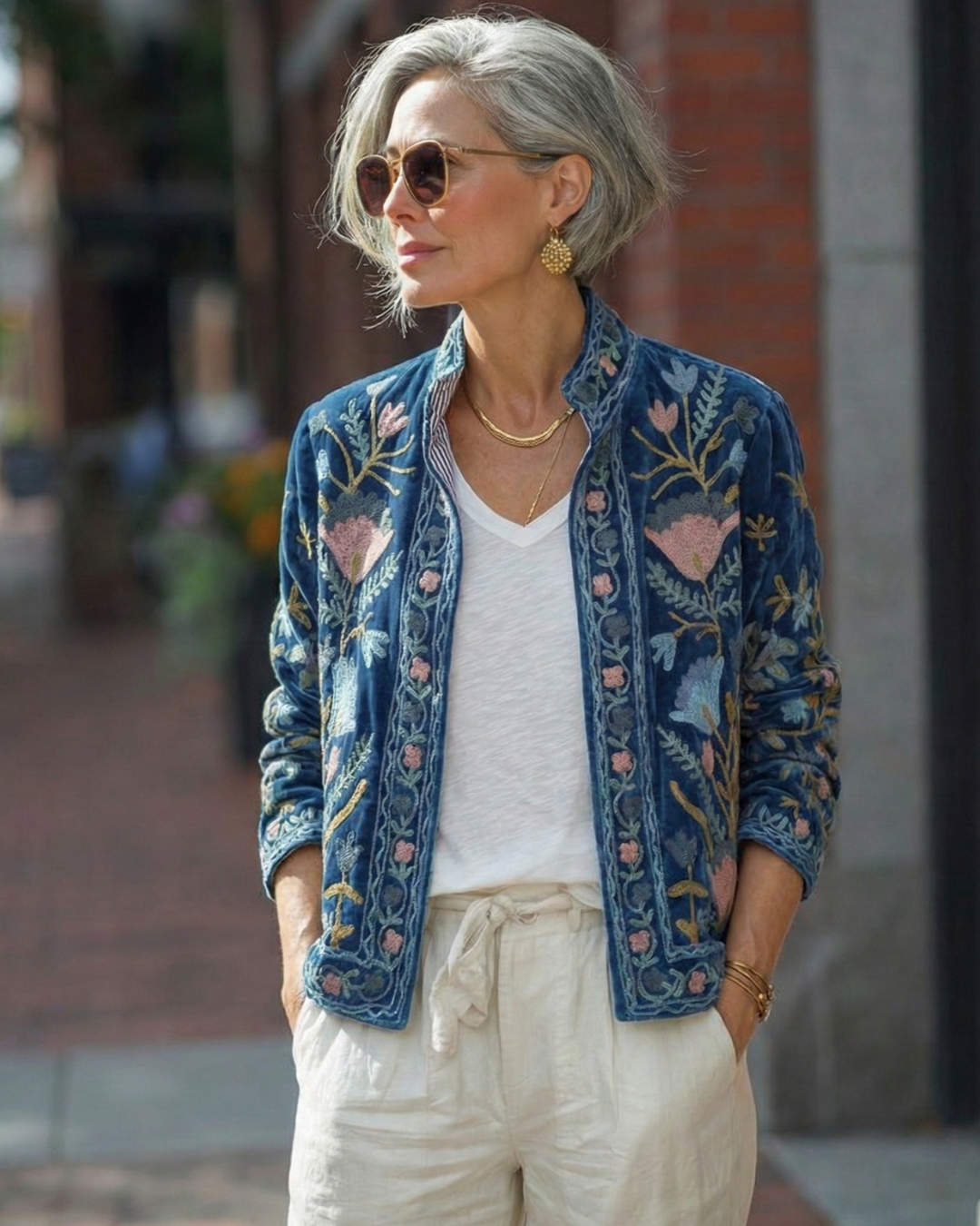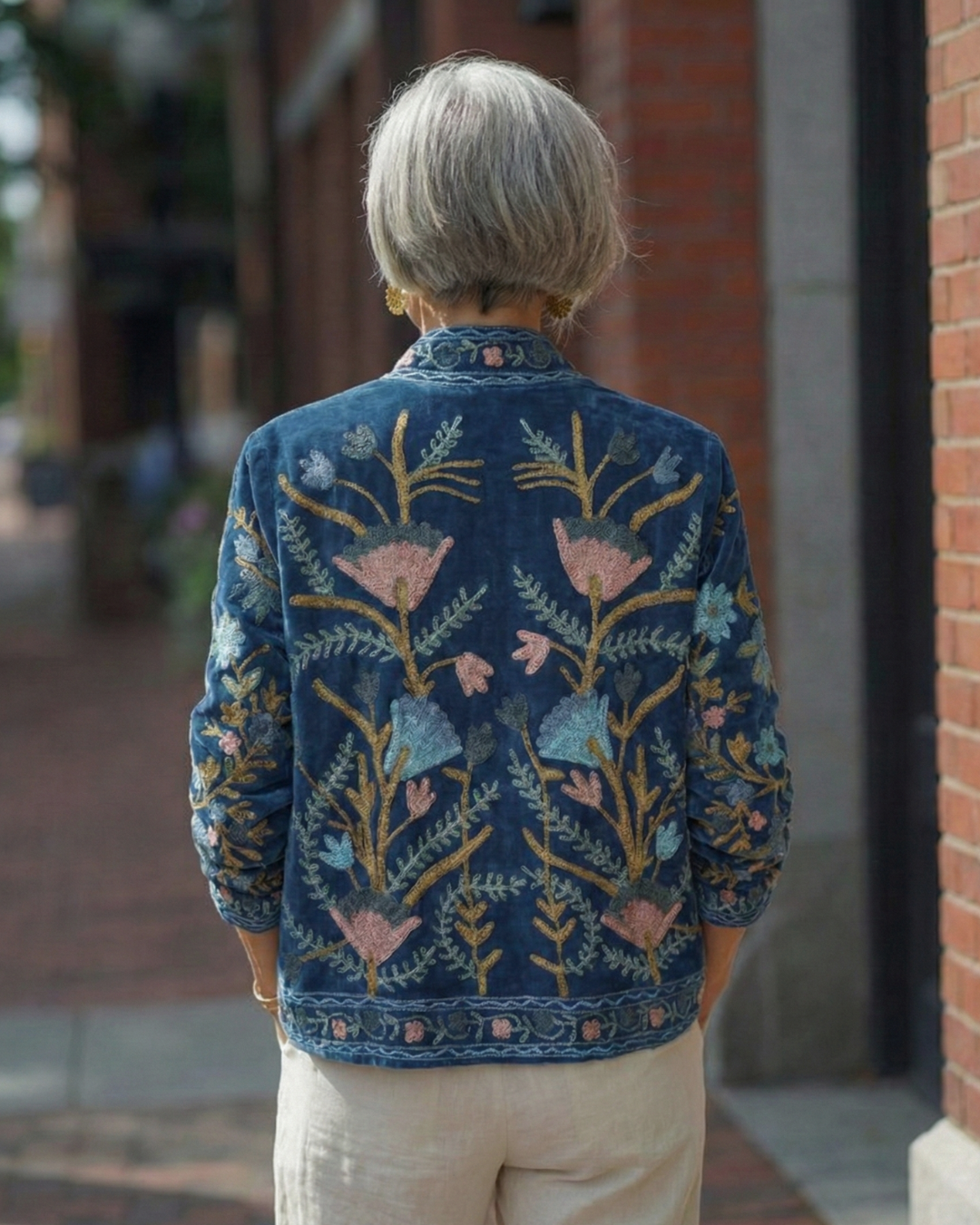 Efni Sléttflauel og bómullar fóður, ísaumur ullarblandaður tvinni.